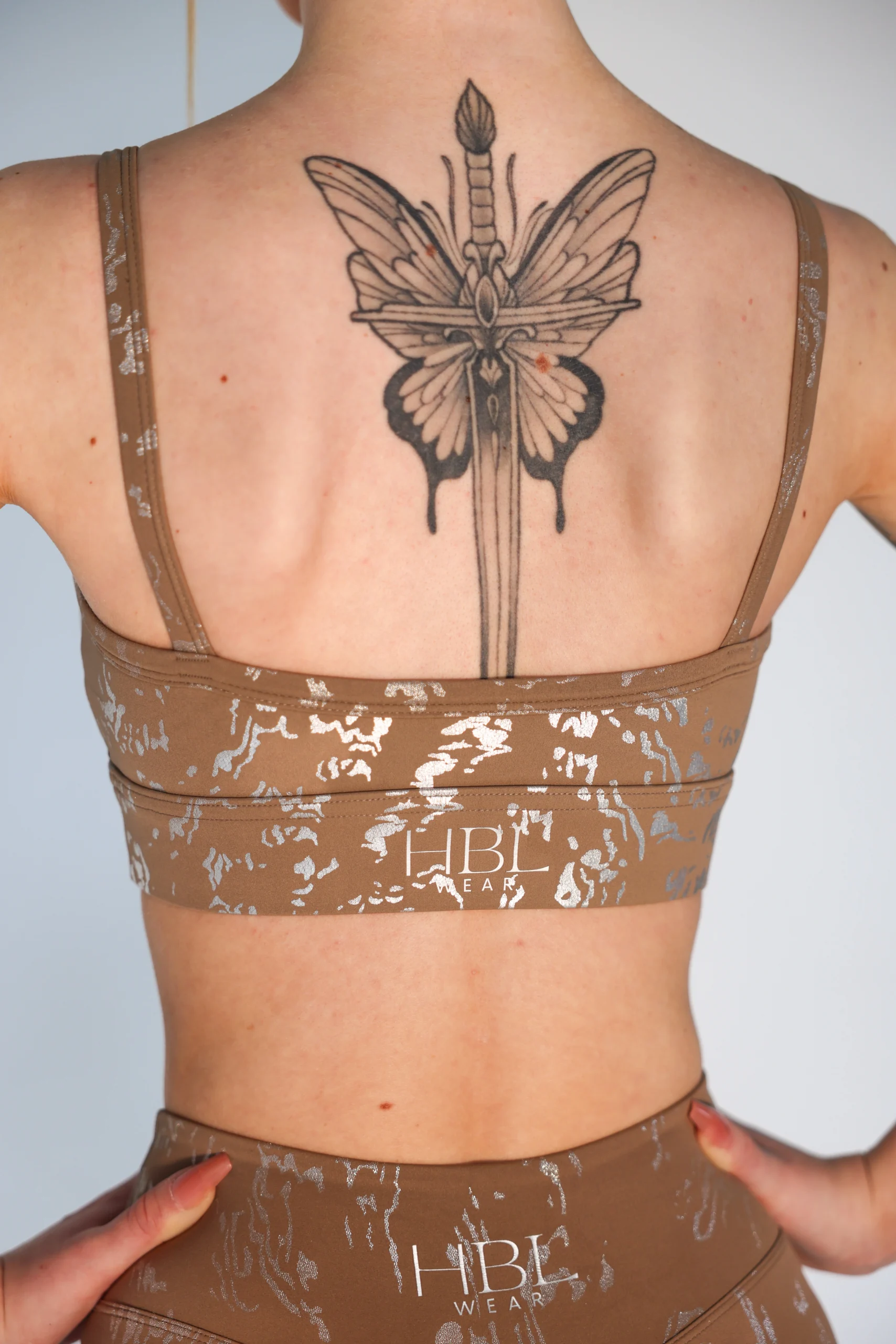 - Beež toon hõbedase sädelusega lisab delikaatset sära, sobides ideaalselt koos retuusidega treeningult linna või kohvijärgsele jalutuskäigule.